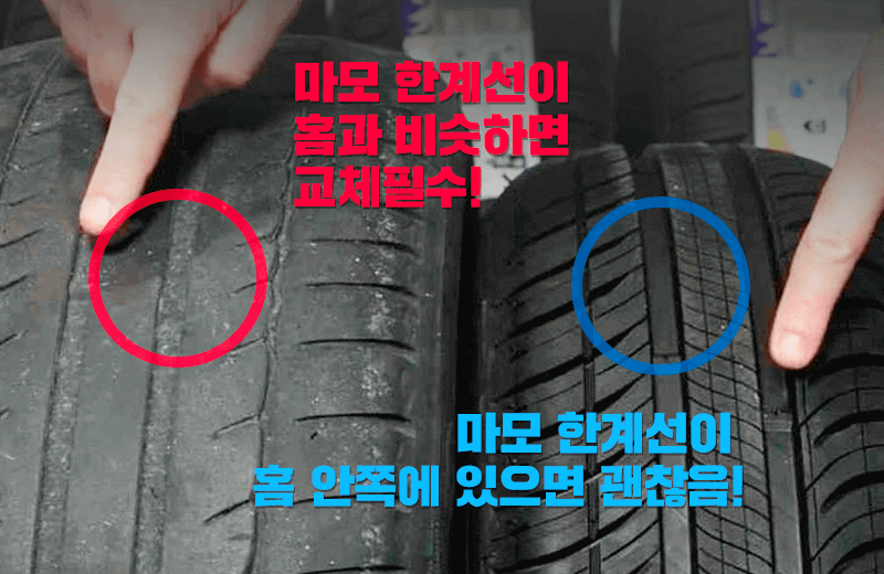 타이어 옆면이나 홈 안쪽의 마모 한계선을 기준으로 점검하세요.